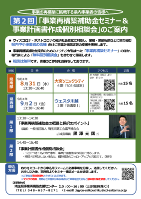 公開日:2022.07.28 経営支援 「事業再構築補助金セミナー&事業計画書作成個別相談会」のご案内 ウィズコロナ・ポストコロナの経済社会変化に対応し、業種・業態転換などに取り組む県内中小事業者の皆様向けに事業計画策定等の支援を実施します。 事業再構築補助金採択のためのノウハウが詰まった「事業再構築セミナー」のほか、専門家による「無料個別相談会」も合わせて開催します。 相談は無料です。皆様のご参加をお待ちしております。 ■ お申し込みフォームはこちら