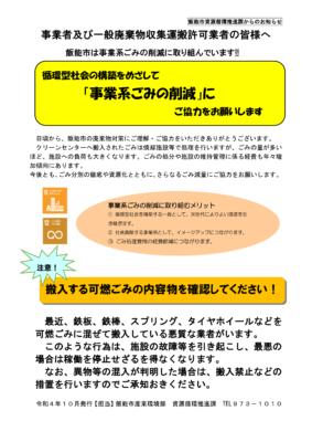 公開日:2022.10.03 お知らせ 「循環型社会の構築をめざして「事業系ごみの削減」にご協力をお願いします 【飯能市PR】 クリーンセンターへ搬入されたごみは焼却施設等で処理を行いますが、ごみの量が多いほど、施設への負荷も大きくなります。 ごみの処分や施設の維持管理に係る経費も年々増加傾向にあります。今後とも、ごみ分別の徹底や資源化とともに、さらなるごみ減量にご協力をお願いします。詳細は以下資料よりご確認ください。