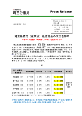 公開日:2022.11.01 お知らせ 埼玉県の特定(産業別)最低賃金の改正のお知らせ 【埼玉労働局】 令和4年12月1日から5業種の埼玉県特定(産業別)最低賃金の時間額がそれぞれ、非鉄金属製造業は1,006円、電子部品等製造業は1,013円、輸送用機械器具製造業は1,013円、光学機械器具等製造業は1,022円、自動車小売業は1,018円となりました。 詳しくは、 埼玉労働局労働基準部賃金室(電話048-600-6205) 又は 労働基準監督署 へお問い合わせください。