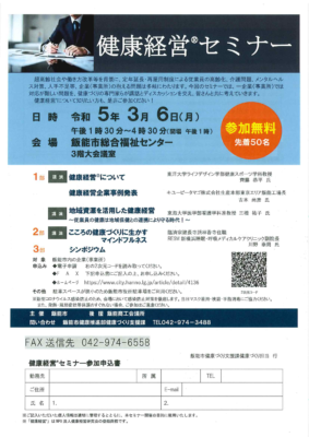 公開日:2023.01.24 お知らせ 健康経営®セミナーのご案内【飯能市PR】 超高齢社会や働き方改革等を背景に、定年延長・再雇用制度による従業員の高齢化、介護問題、メンタルヘルス対策、人手不足等、企業(事業所)の抱える問題は多岐にわたります。今回のセミナーでは、一企業(事業所)では対応が難しい問題を、健康づくりの専門家らが講話とディスカッションを交え、皆さんと共に考えていきます。健康経営®について知りたい方も、是非ご参加ください。