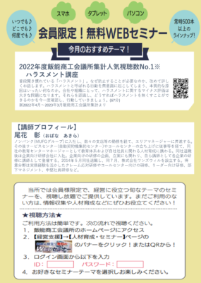 公開日:2023.07.05 セミナー 【7月号】セミナーオンデマンド(Webセミナー)のご案内 飯能商工会議所では、会員事業所限定で、経営に役立つ旬なテーマのセミナーを、視聴し放題でご提供しています。まだご利用のない方は、情報収集や人材育成などにぜひお役立てください! ログインID及びパスワードにつきましては、飯能商工会議所会報誌またはお電話にてお問合せください。