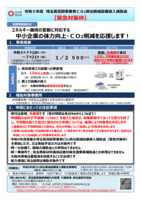 公開日:2023.06.14 経営支援 令和5年度埼玉県民間事業者CO2排出削減設備導入補助金【緊急対策枠】について エネルギー価格の変動に対応する中小企業の体力向上・CO2削減を応援します! 対象経費➀高効率省エネ設備への更新等➁再エネ設備の導入 詳細はこちら令和5年度 CO2排出削減設備導入事業【緊急対策枠】 - 埼玉県 (saitama.lg.jp)