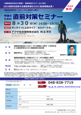 アクサ生命保険(株)埼玉支社では、商工会議所会員で、健康経営優良法人2024(中小規模法人部門)の申請をお控えの企業様、検討中の企業様を対象に、申請直前対策セミナーをオンラインで開催いたします。