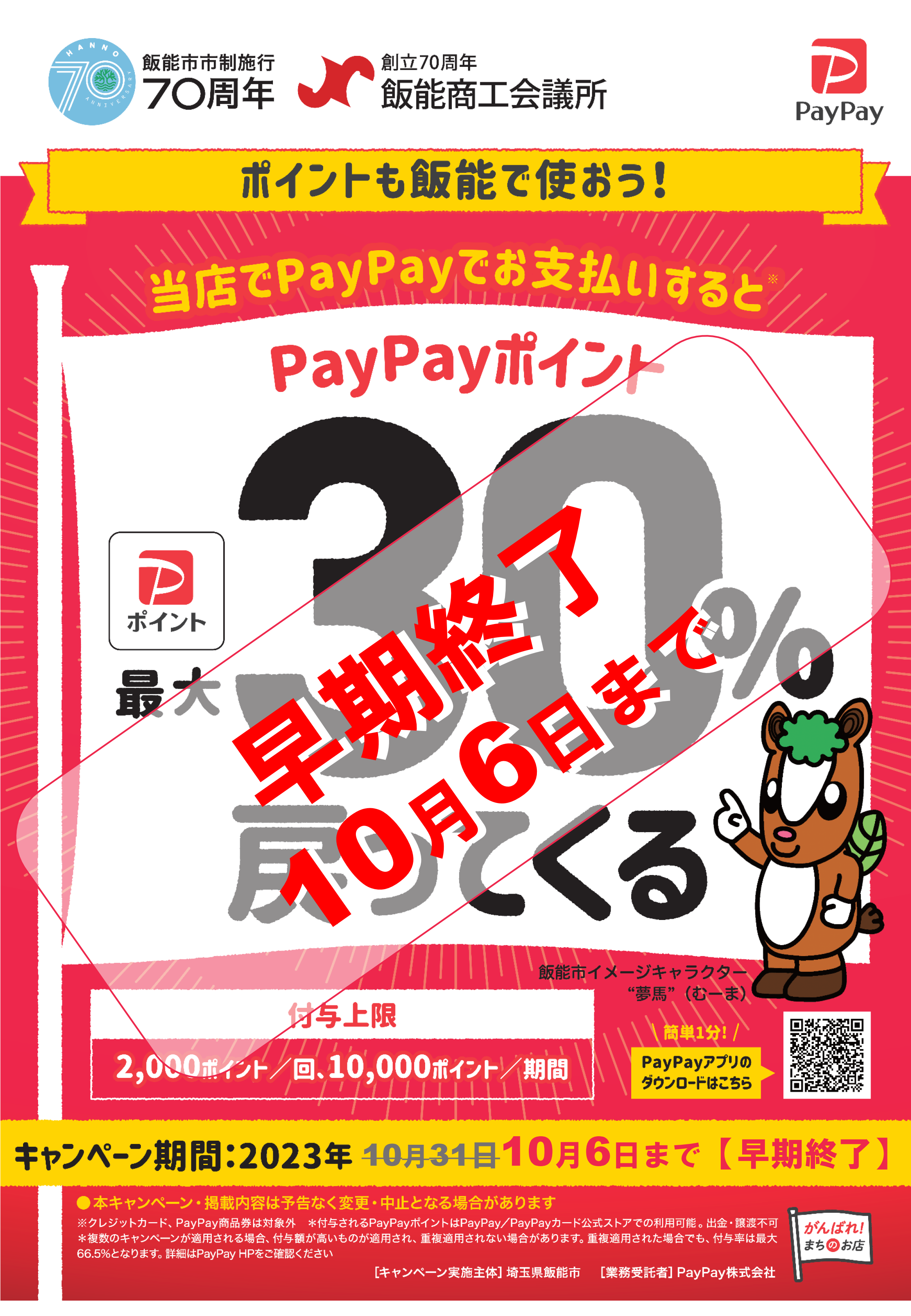 【重要】がんばろう飯能市!最大30%戻ってくるキャンペーンの早期終了について 現在、飯能市において実施している表記のキャンペーンにつきましては、予想を上回るご利用をいただき、PayPayポイントの付与総額が上限の金額に達する見込みとなりましたため、以下のとおり早期終了となりますのでお知らせします。 キャンペーン終了日時令和5年10月6日(金)23時59分 ※令和5年10月7日(土)午前0時以降に決済した場合、ポイント還元は行われませんのでご注意ください。
