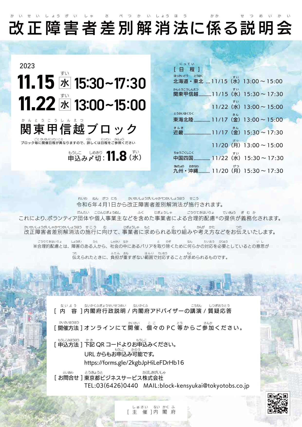 令和6年4月1日から改正障害者差別解消法が施行されます。これにより、ボランティア団体や個人事業主などを含めた事業者による合理的配慮※の提供が義務化されます。改正障害者差別解消法の施行に向けて、事業者に求められる取り組みや考え方などを本説明会よりお伝えいたします。詳細は下記チラシよりご覧ください。