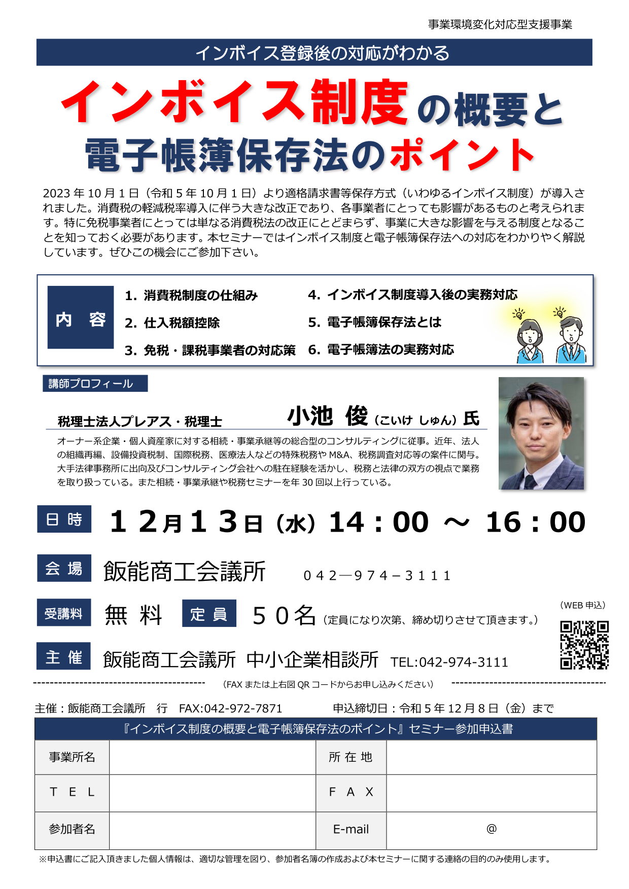 2023年10月より運用が始まったインボイス制度と喫緊である令和6年1月より正式に施行される電子帳簿保存法について、本セミナーでは各種制度における実務対応についてわかりやすく解説をいたします。
