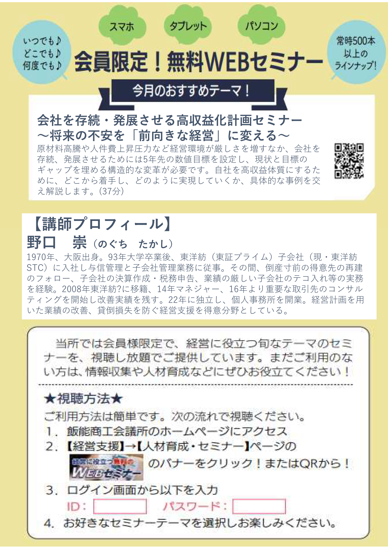 公開日:2024.01.05 セミナー 【1月号】セミナーオンデマンド(Webセミナー)のご案内 飯能商工会議所では、会員事業所限定で、経営に役立つ旬なテーマのセミナーを、視聴し放題でご提供しています。まだご利用のない方は、情報収集や人材育成などにぜひお役立てください!ログインID及びパスワードにつきましては、飯能商工会議所会報誌またはお電話にてお問合せください。