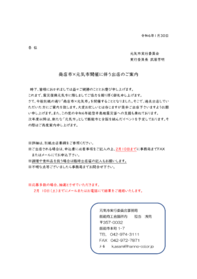 さて、今般別紙の通り「商店市×元気市」を開催することとなりました。そこで、過去出店していただいた方にご案内を致します。