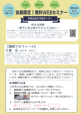 飯能商工会議所では、会員事業所限定で、経営に役立つ旬なテーマのセミナーを、視聴し放題でご提供しています。