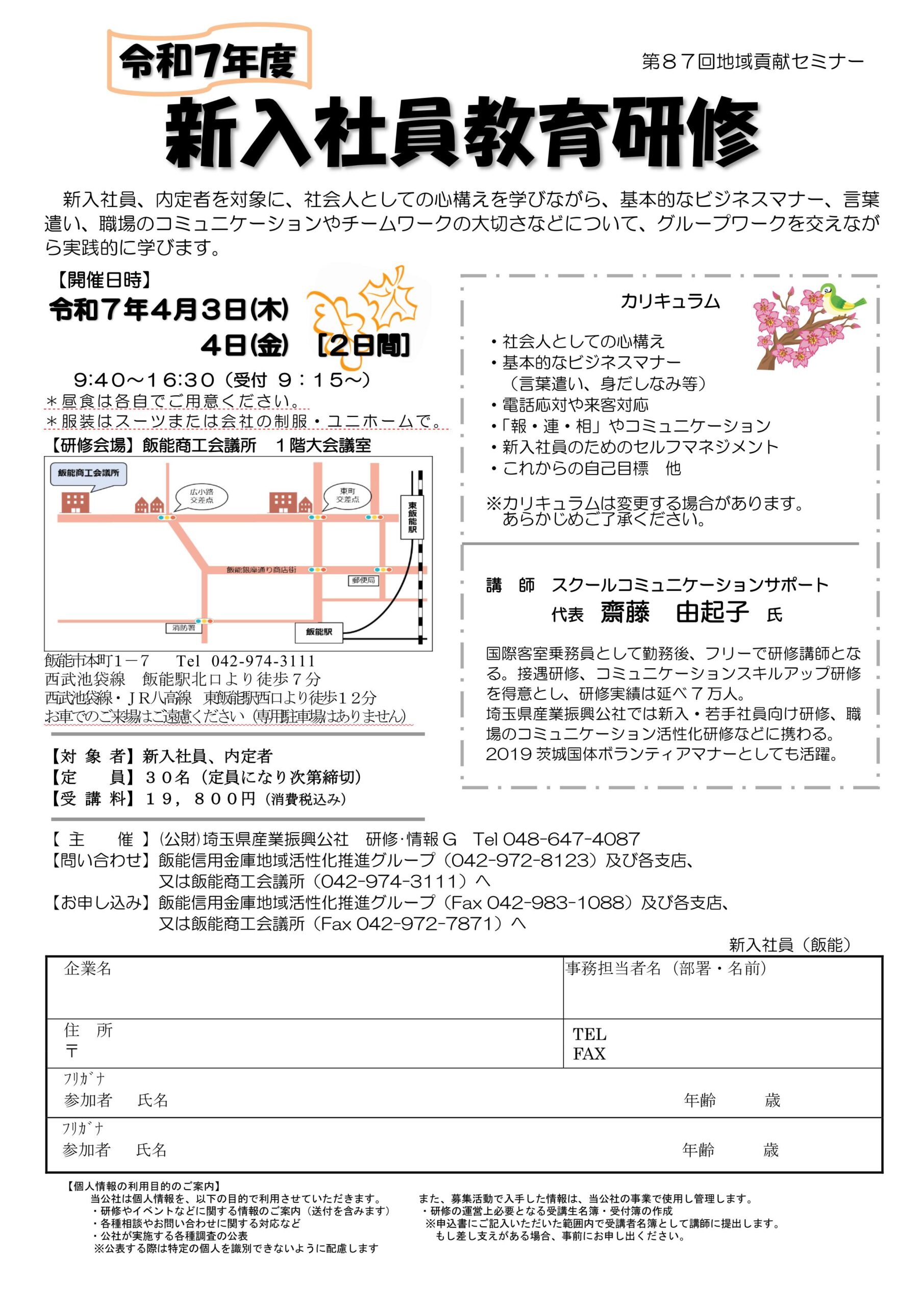 公開日:2025.02.05 検定 令和7年度新入社員教育研修のご案内 新入社員、内定者を対象に、社会人としての心構えを学びながら、基本的なビジネスマナー、言葉遣い、職場のコミュニケーションやチームワークの大切さなどについて、グループワークを交えながら実践的に学ぶ新入社員教育研修を開催いたします。詳細は以下チラシよりご覧ください。